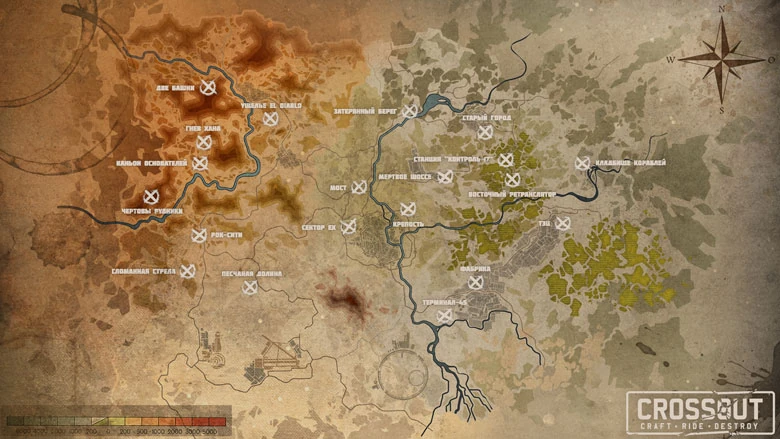- На карте, приведенной в описании обновления и на сайте, можно увидеть местоположение всех игровых локаций в мире Crossout.
